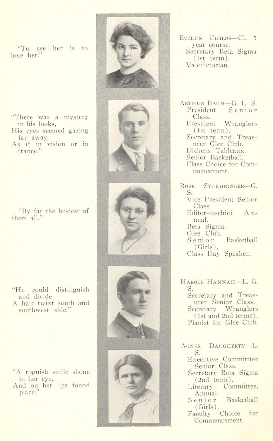 1912 Glenville High School, Page 11: Evelyn Childs, Arthur Bach, Rose Stuehringer, Harold Hannah, Agnes Daugherty.