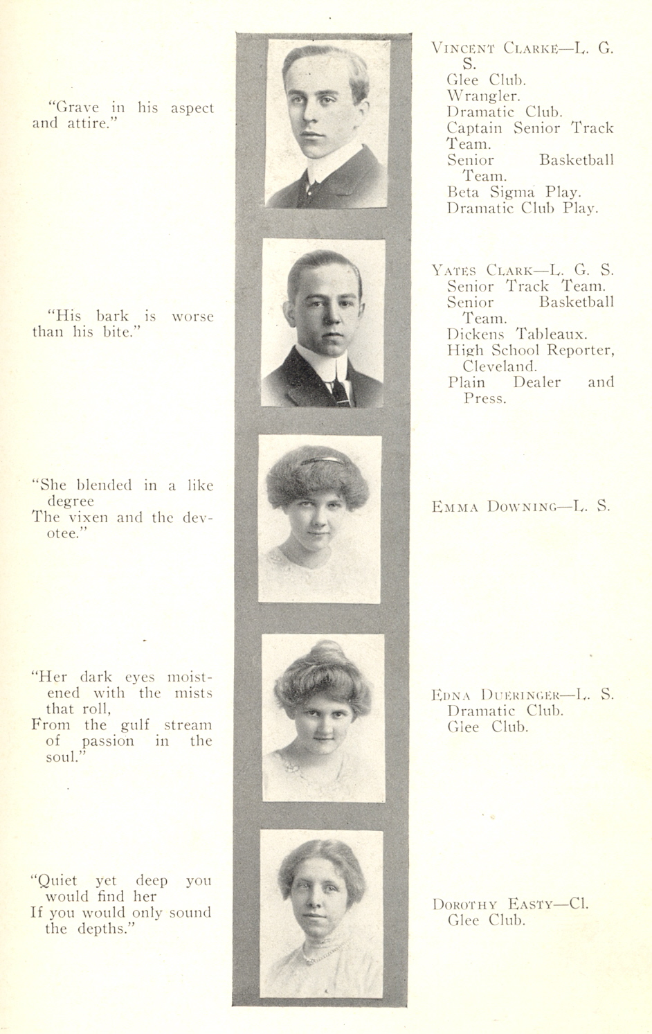 1912 Glenville High School, Page 15: Vincent Clarke, Yates Clark, Emma Downing, Edna Dueringer, Dorothy Easty.