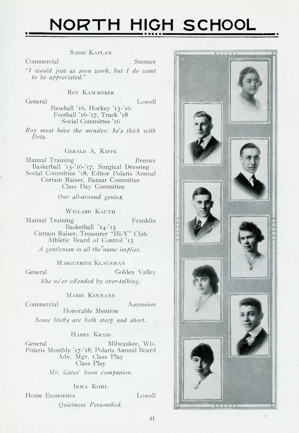 1918 Minneapolis North High School, Page 41: Sadie Kaplan, Roy Kammerer, Gerald A. Kiffe, Willard Kauth, Marguerite Klausman, Marie Kinnane, Harry Krass, Irma Kohl.