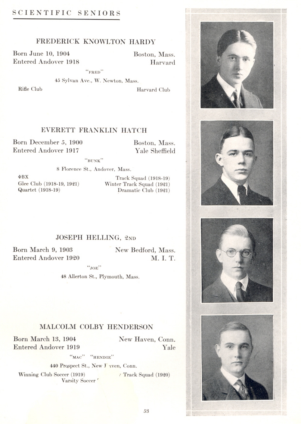 1921 Phillips Andover Academy, Page 53: Frederick Knowlton Hardy, Everett Franklin Hatch, Joseph Helling 2nd, Malcolm Colby Henderson.