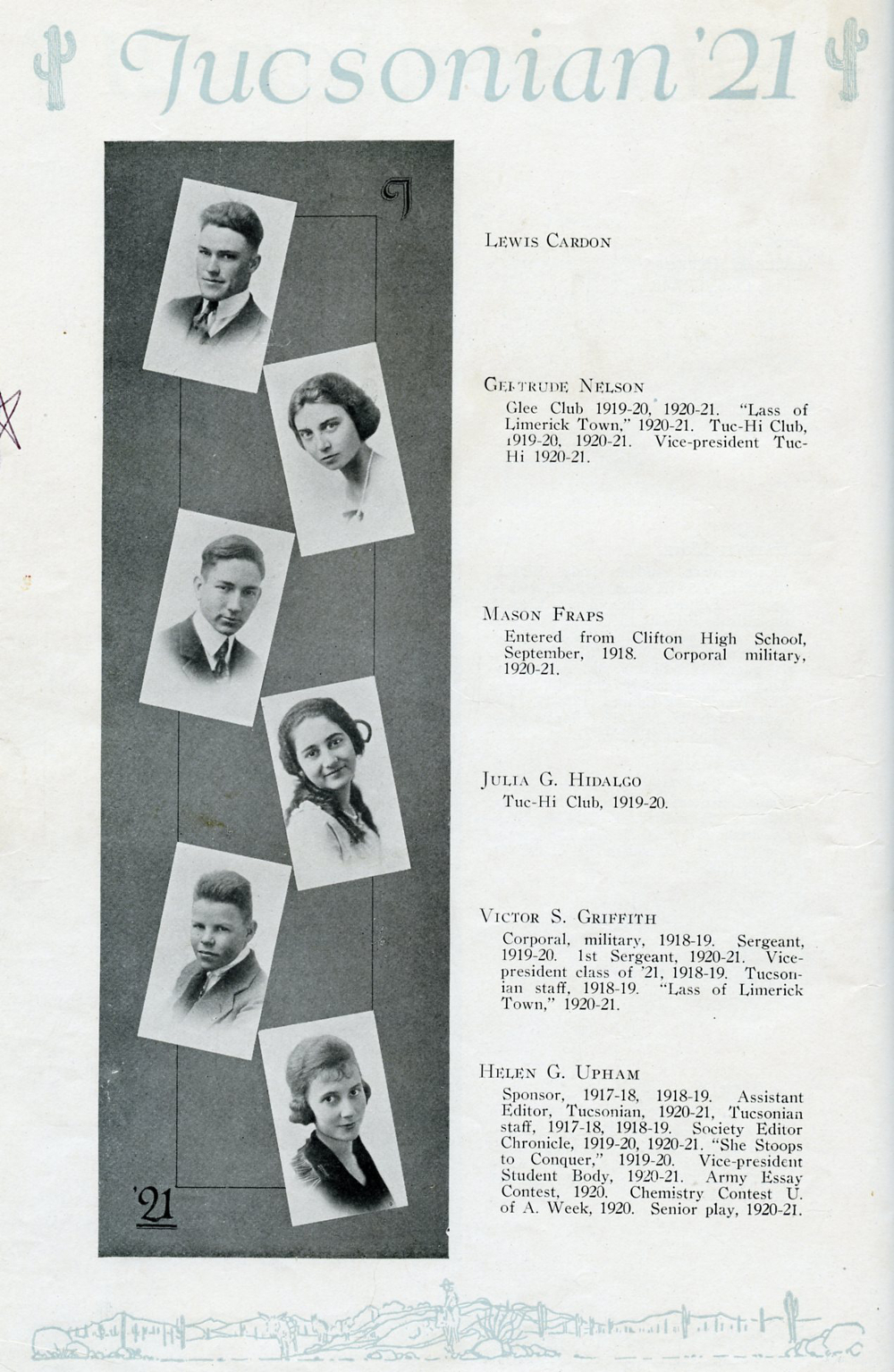 1921 Tucson High School, Page 26: Lewis Cardon, Gertrude Nelson, Mason Fraps, Julia G. Hidalgo, Victor S. Griffith, Helen G. Upham.