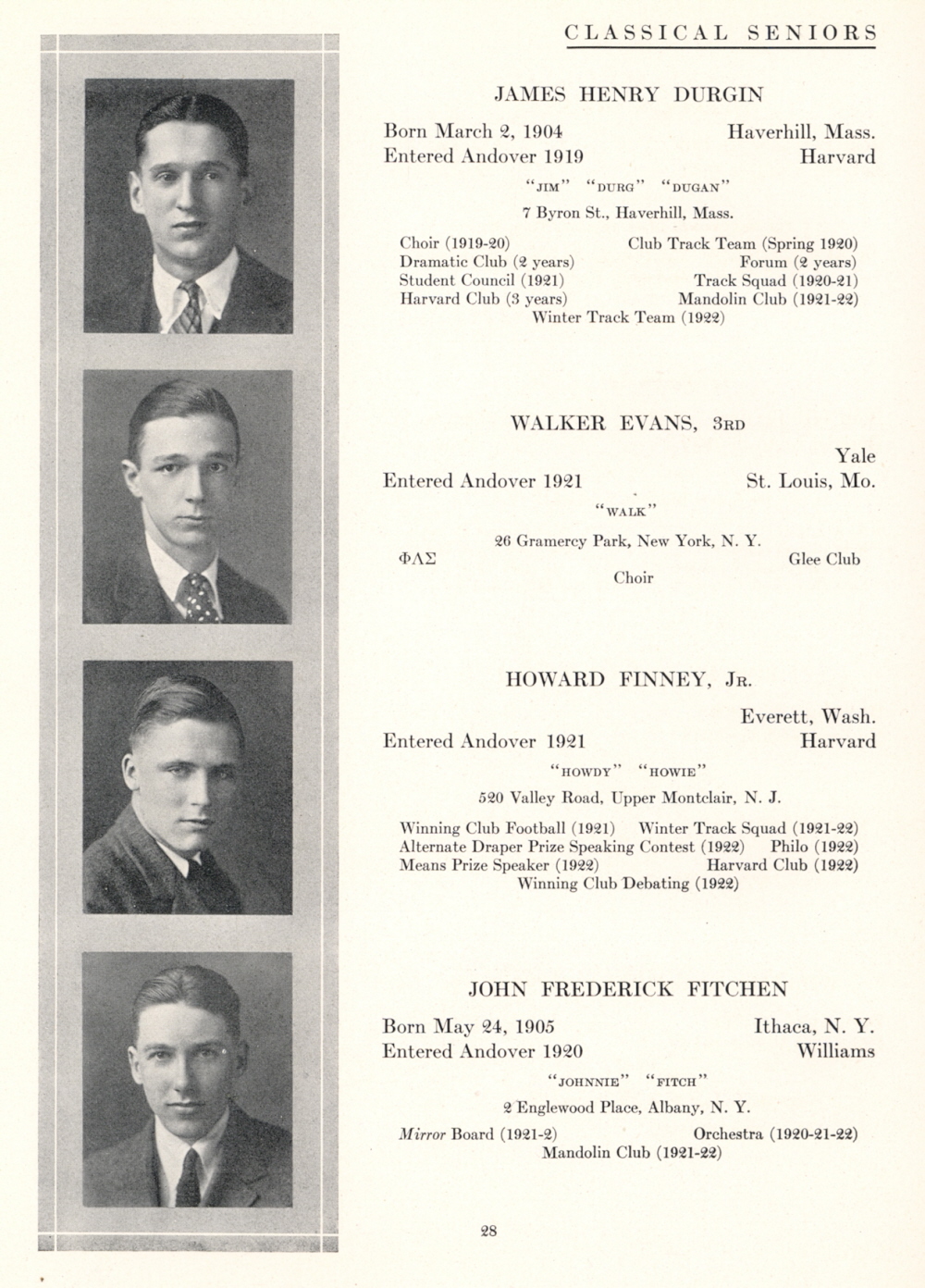 1922 Phillips Andover Academy, Page 28: James Henry Gurgin, Walker Evans 3rd, Howard Finney Jr., John Frederick Fitchen.