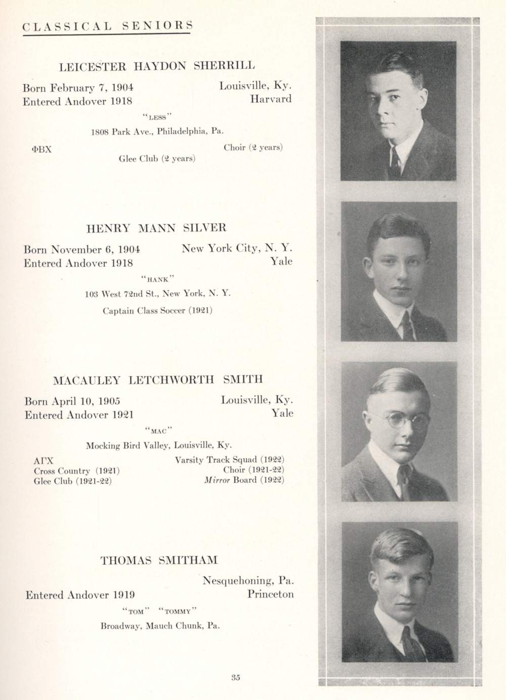 1922 Phillips Andover Academy, Page 35: Leicester Haydon Sherrill, Henry Mann Silver, Macauley Letchworth Smith, Thomas Smitham.
