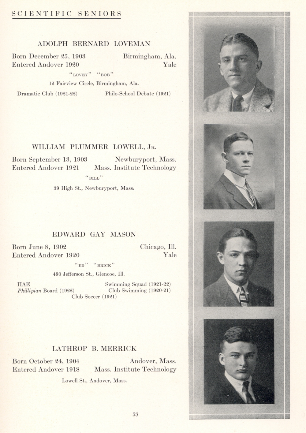 1922 Phillips Andover Academy, Page 53: Adolph Bernard Loveman, William Plummer Lowell Jr., Edward Gay Mason, Lathrop B. Merrick.