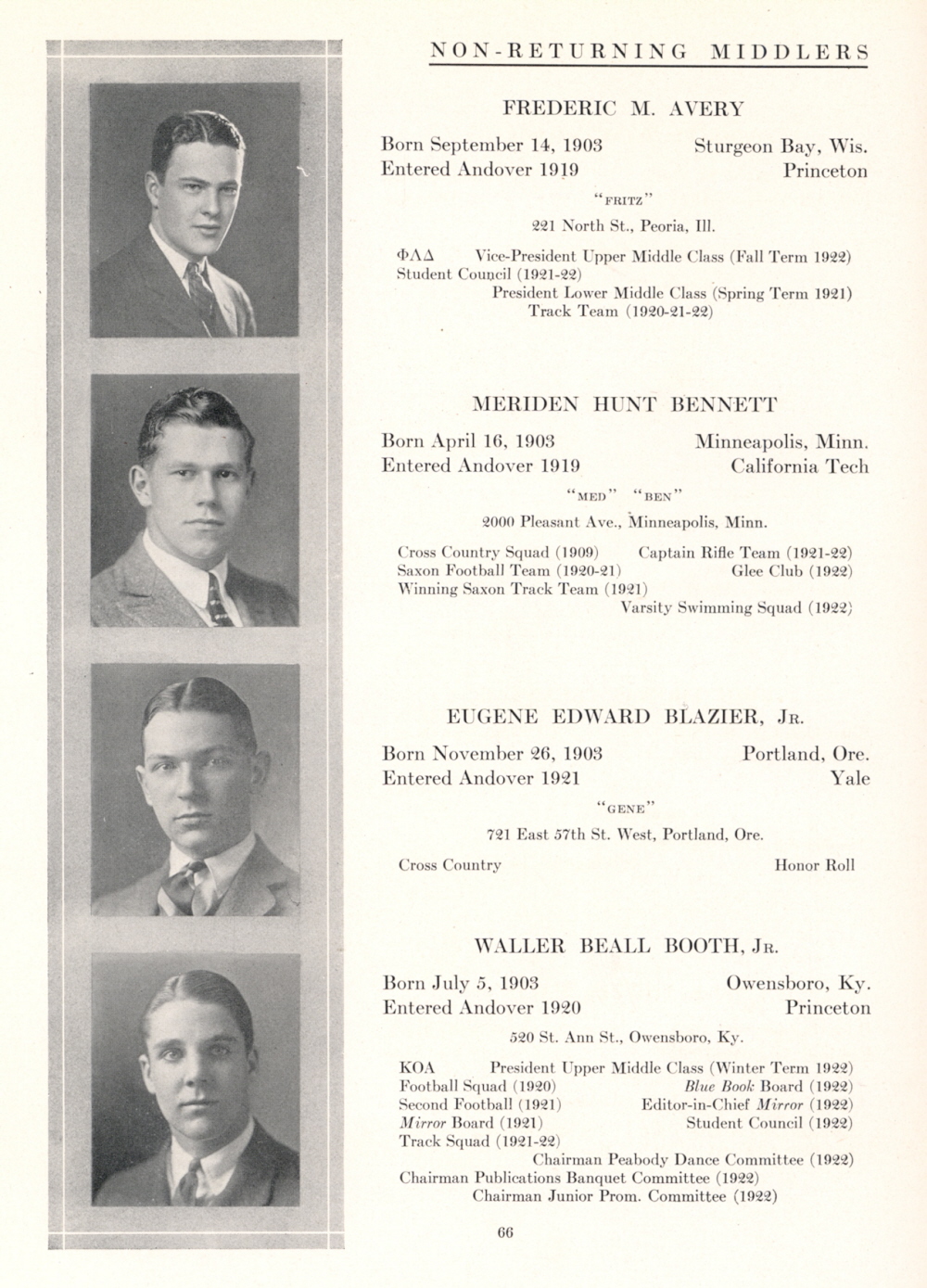1922 Phillips Andover Academy, Page 66: Frederic M. Avery, Meriden Hunt Bennett, Eugene Edward Blazier Jr., Waller Beall Booth Jr.