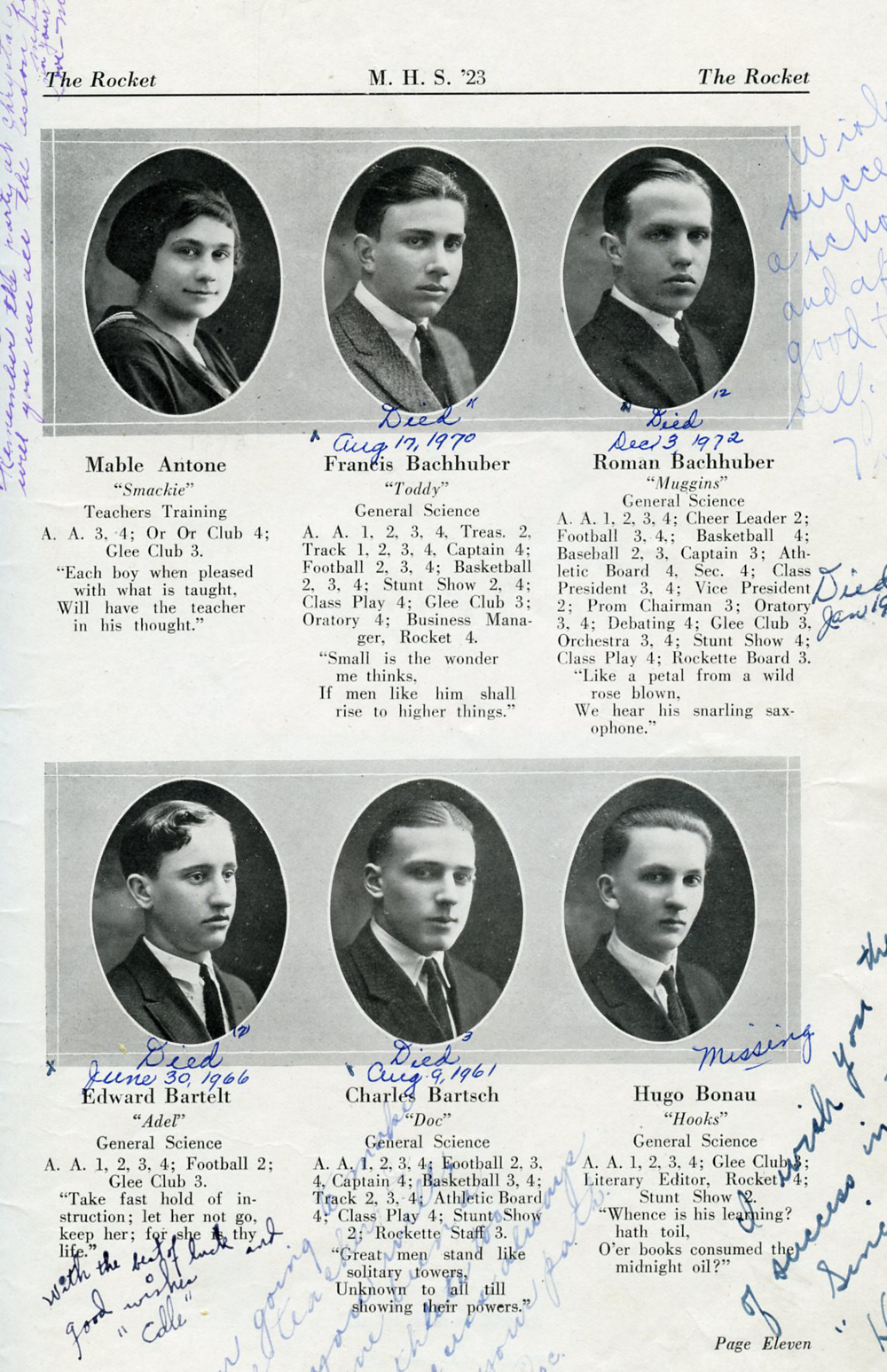 1923 Mayville High School Yearbook, Page 11: Mable Antone, Francis Bachhuber, Roman Bachhuber, Edward Bartelt, Charles Bartsch, Hugo Bonau.