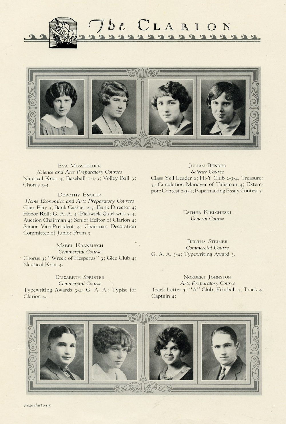 1925 Appleton High School, Page 36: Eva Mossholder, Dorothy Engler, Mabel Kranzusch, Elizabeth Sprister, Julian Bender, Esther Kielcheski, Bertha Steiner, Norbert Johnston.