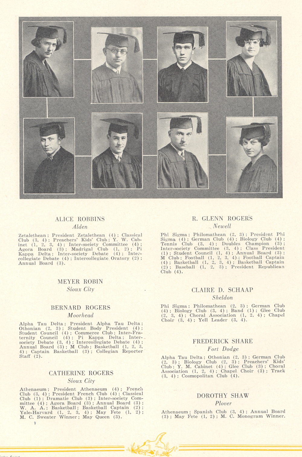 1926 Morningside College, Page 34: Alice Robbins, Meyer Robin, Bernard Rogers, Catherine Rogers, R. Glenn Rogers, Claire D. Schaap, Frederick Share, Dorothy Shaw.