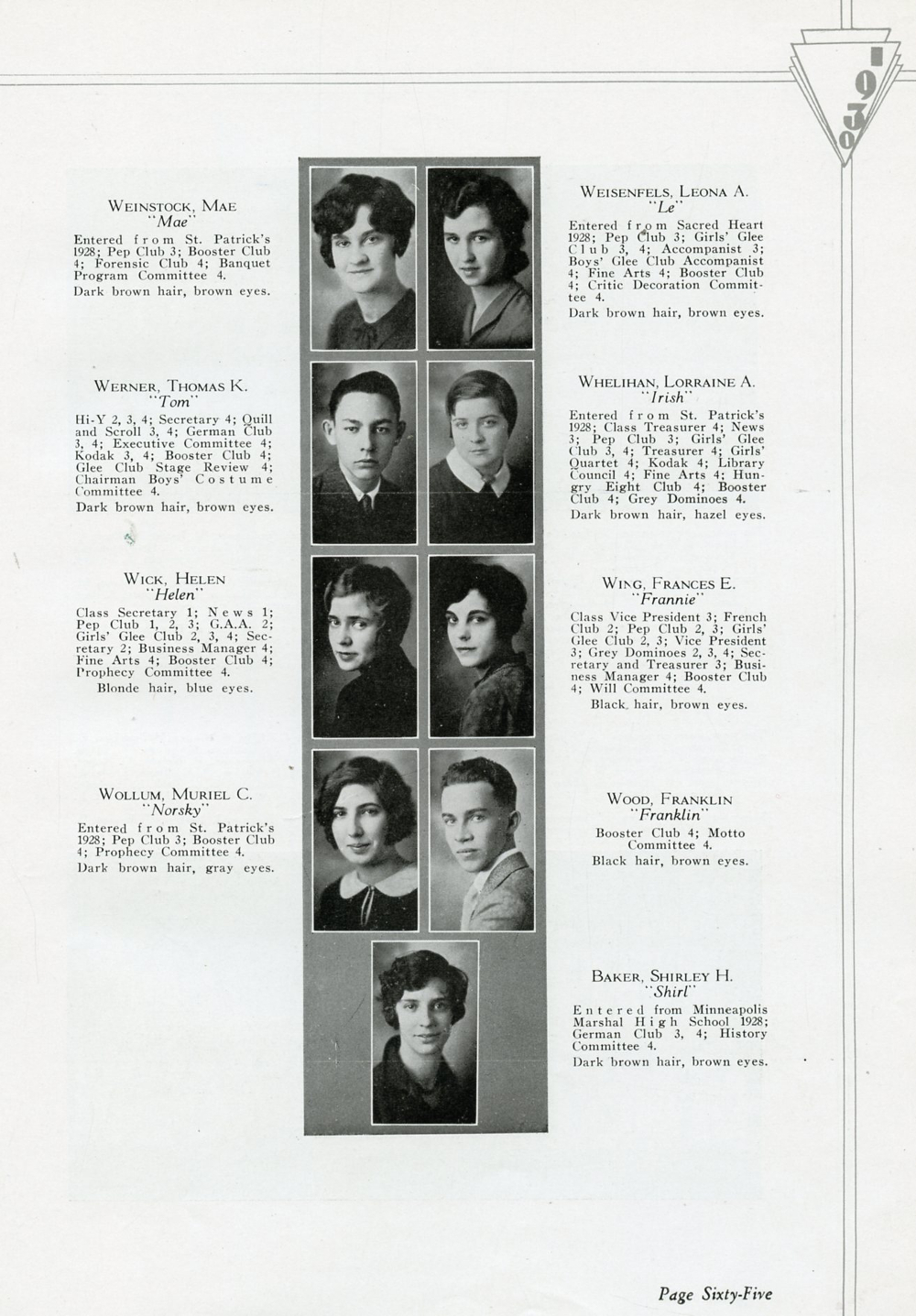 1930 Eau Claire High School, Page 65: Mae Weinstock, Leona A. Weisenfels, Thomas K. Werner, Lorraine A. Whelihan, Helen Wick, Frances E. Wing, Muriel C. Wollum, Franklin Wood, Shirley H. Baker.