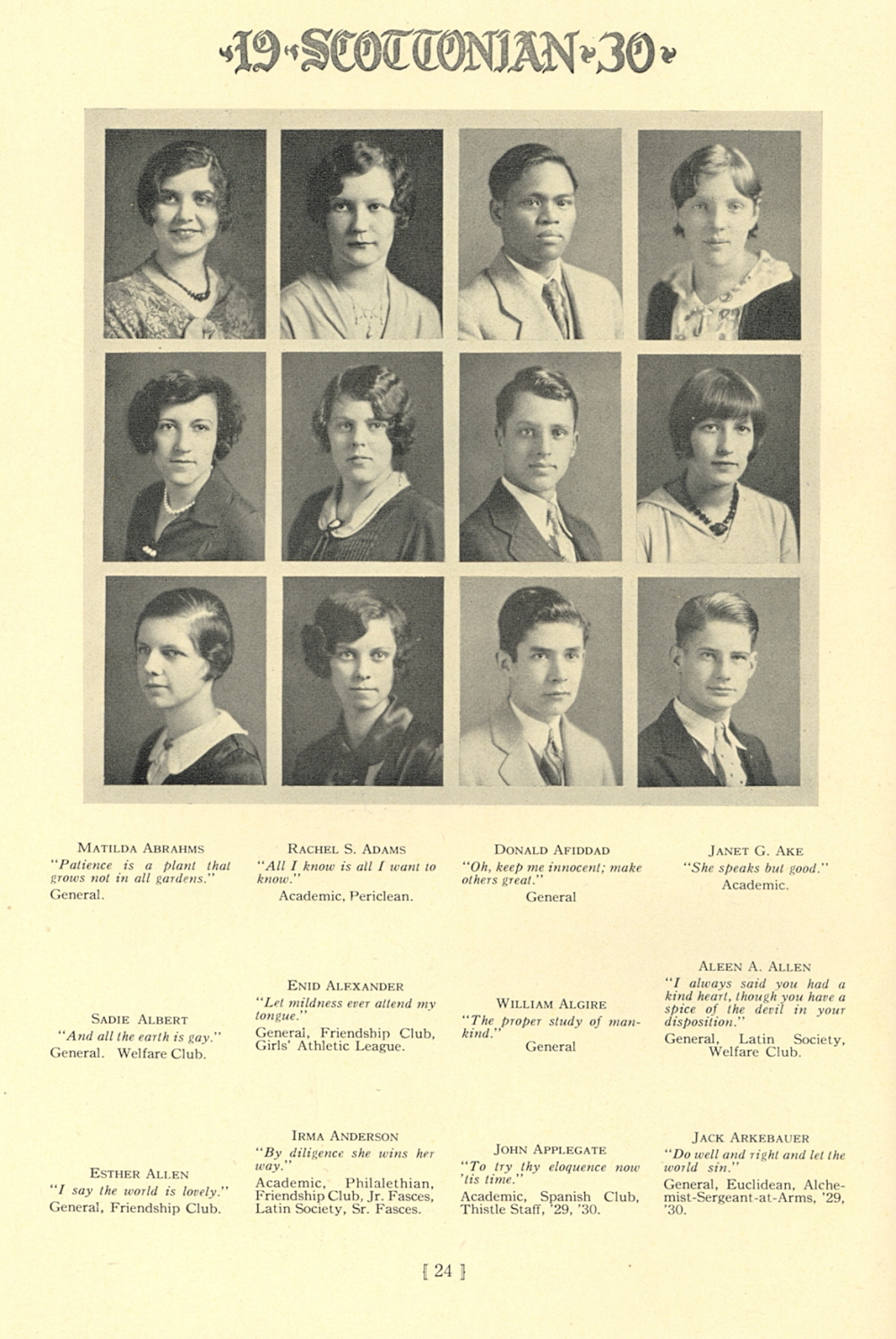1930 Scott High School, Page 24: Matilda Abrahms, Rachel S. Adams, Donald Afiddad, Janet G. Ake, Sadie Albert, Enid Alexander, William Algire, Aleen A. Allen, Esther Allen, Irma Anderson, John Applegate, Jack Arkebauer.
