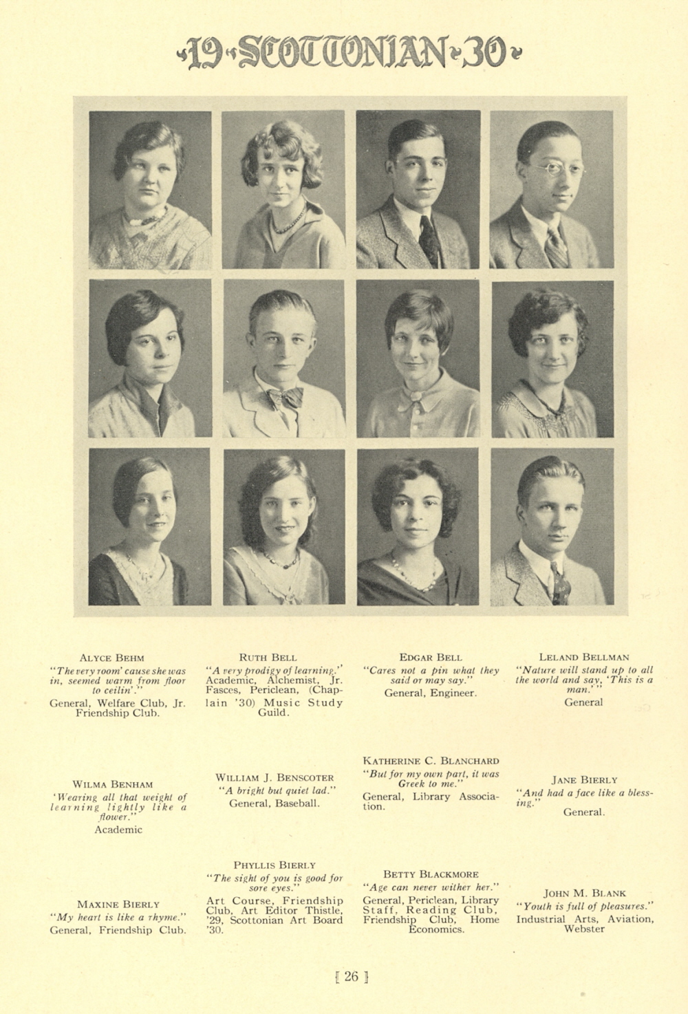 1930 Scott High School, Page 26: Alyce Behm, Ruth Bell, Edgar Bell, Leland Bellman, Wilma Benham, William J. Benscoter, Katherine C. Blanchard, Jane Bierly, Maxine Bierly, Phyllis Bierly, Betty Blackmore, John M. Blank.