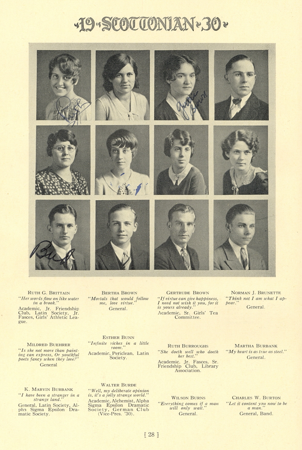 1930 Scott High School, Page 28: Ruth G. Brittain, Bertha Brown, Gertrude Brown, Norman J. Brunette, Mildred Buehrer, Esther Bunn, Ruth Burroughs, Martha Burbank, K. Marvin Burbank, Walter Burde, Wilson Burns, Charles W. Burton.