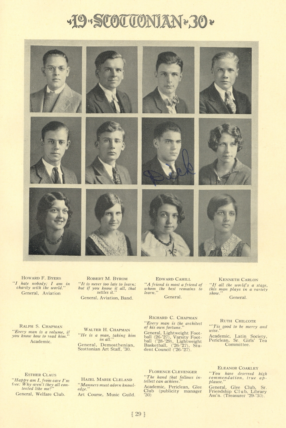 1930 Scott High School, Page 29: Howard F. Byers, Robert M. Byrom, Edward Cahill, Kenneth Carlon, Ralph S. Chapman, Walter H. Chapman, Richard C. Chapman, Ruth Chilcote, Esther Claus, Hazel Marie Cleland, Florence Clevenger, Eleanor Coakley.