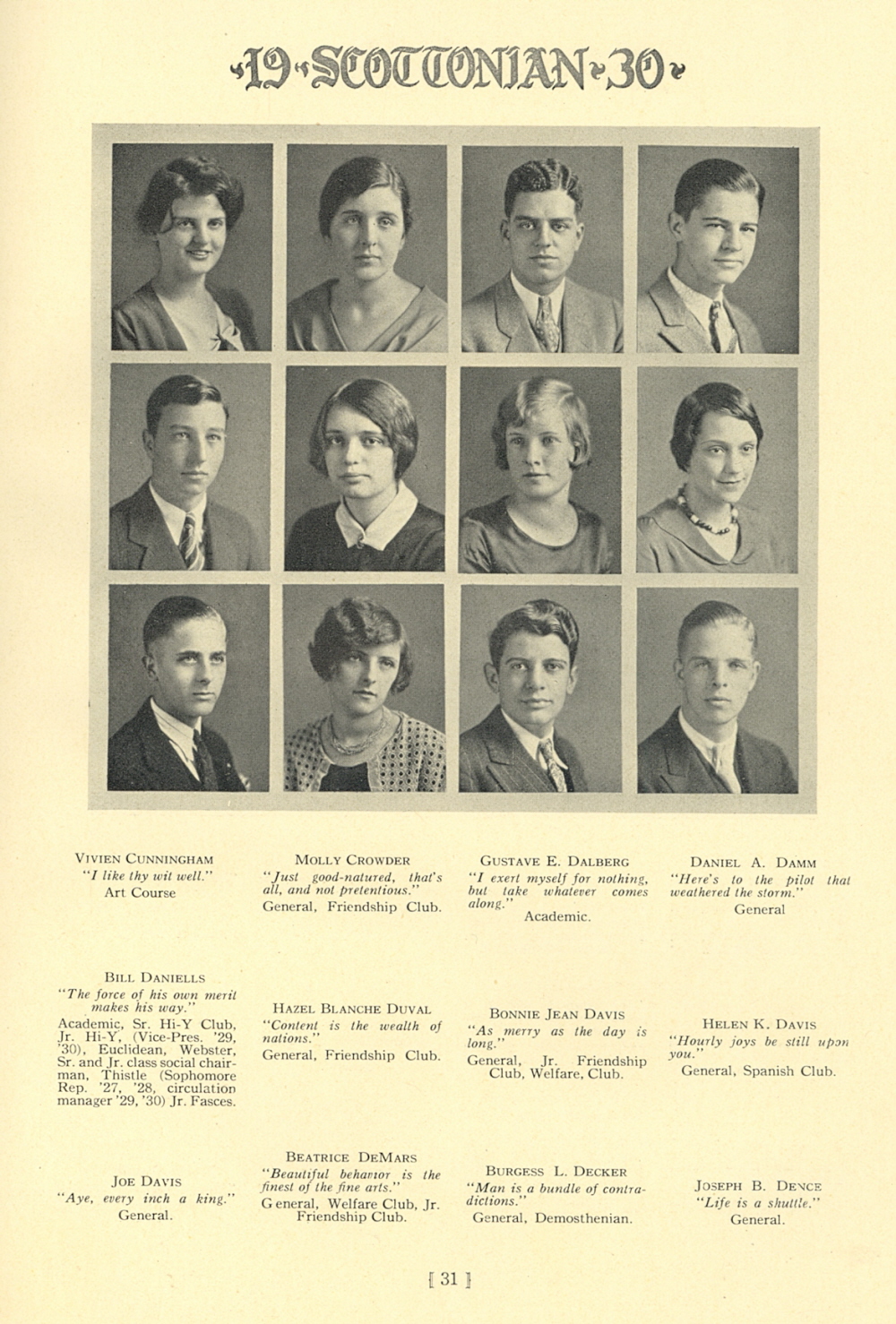 1930 Scott High School, Page 31: Vivien Cunningham, Molly Crowder, Gustave E. Dalberg, Daniel A. Damm, Bill Daniells, Hazel Blanche Duval, Bonnie Jean Davis, Helen K. Davis, Joe Davis, Beatrice DeMars, Burgess L. Decker, Joseph B. Dence.