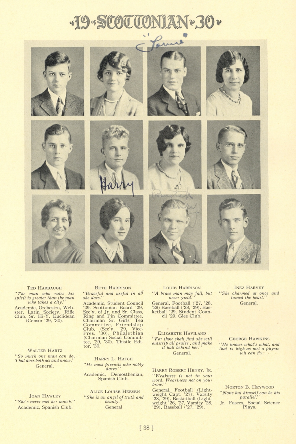 1930 Scott High School, Page 38: Ted Harbough, Beth Harrison, Louie Harrison, Inez Harvey, Walter Hartz, Harry L. Hatch, Elizabeth Haviland, George Hawkins, Joan Hawley, Alice Louise Heesen, Harry Robert Henry Jr., Norton B. Heywood.