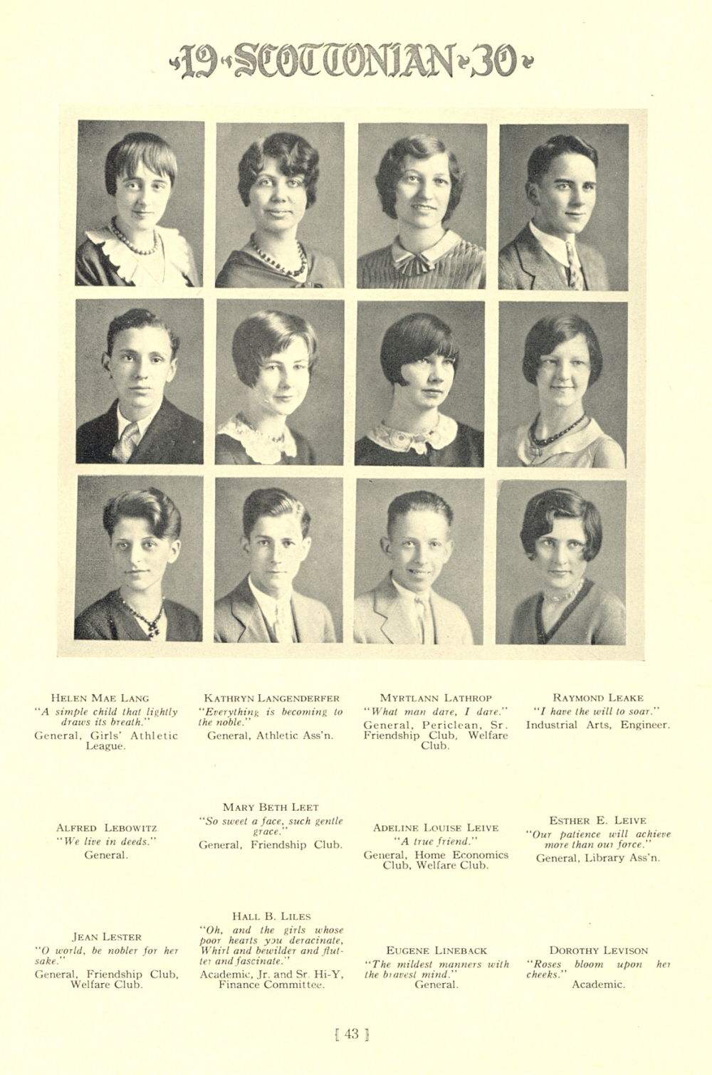 1930 Scott High School, Page 43: Helen Mae Lang, Kathryn Langenderfer, Myrtlann Lathrop, Raymond Leake, Alfred Lebowitz, Mary Beth Leet, Adeline Louise Leive, Esther E. Leive, Jean Lester, Hall B. Liles, Eugene Lineback, Dorothy Levison.