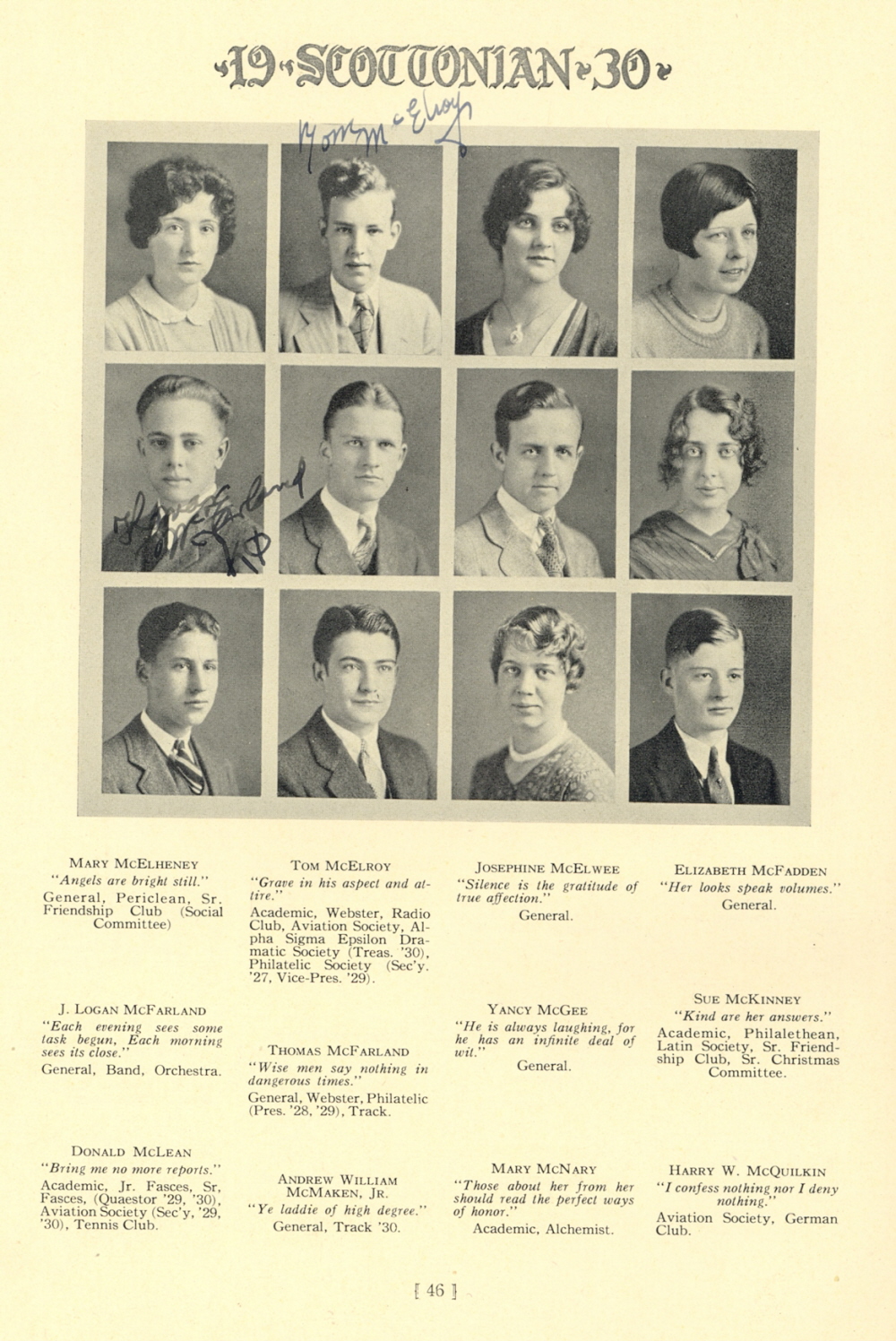 1930 Scott High School, Page 46: Mary McElheney, Tom McElroy, Josephine McElwee, Elizabeth McFadden, J. Logan McFarland, Thomas McFarland, Yancy McGee, Sue McKinney, Donald McLean, Andrew William McMaken Jr., Mary McNary, Harry W. McQuilkin.