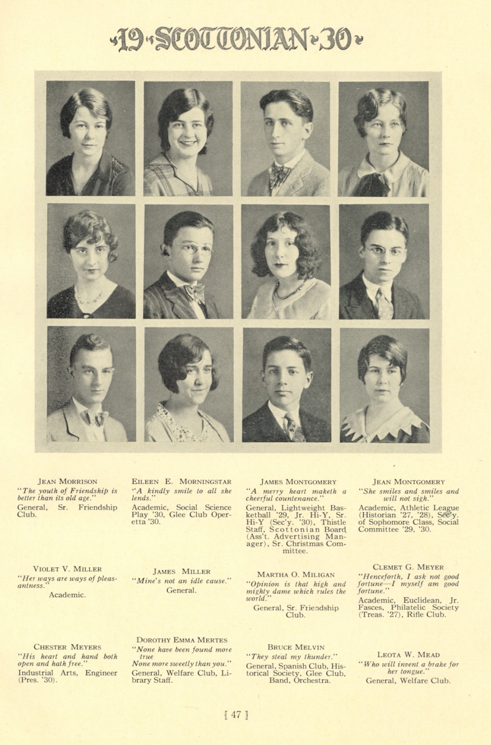 1930 Scott High School, Page 47: Jean Morrison, Eileen E. Morningstar, James Montgomery, Jean Montgomery, Violet V. Miller, James Miller, Martha O. Miligan, Clement G. Meyer, Chester Meyers, Dorothy Emma Mertes, Bruce Melvin, Leota W. Mead.