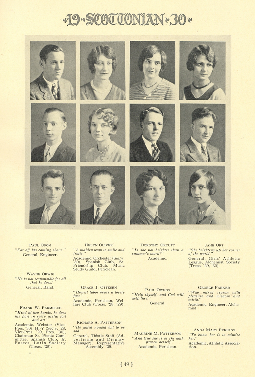 1930 Scott High School, Page 49: Paul Odom, Helyn Oliver, Dorothy Orcutt, Jane Ort, Wayne Orwig, Grace J. Otteson, Paul Owens, George Parker, Frank W. Parmelee, Richard A. Patterson, Maurine M. Patterson, Anna Mary Perkins.