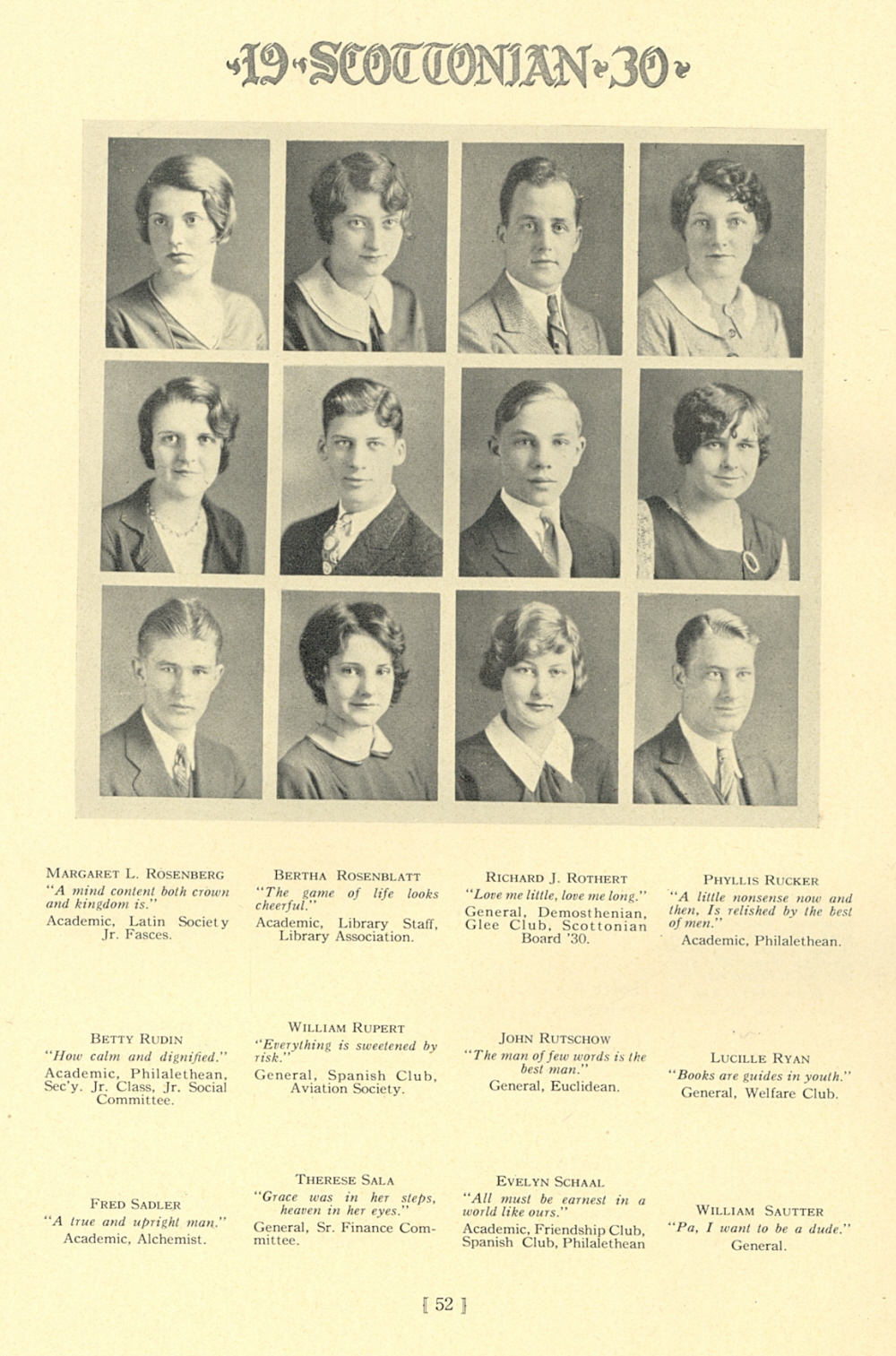 1930 Scott High School, Page 52: Margaret L. Rosenberg, Bertha Rosenblatt, Richard J. Rothert, Phyllis Rucker, Betty Rudin, William Rupert, John Rutschow, Lucille Ryan, Fred Sadler, Therese Sala, Evelyn Schaal, William Sautter.