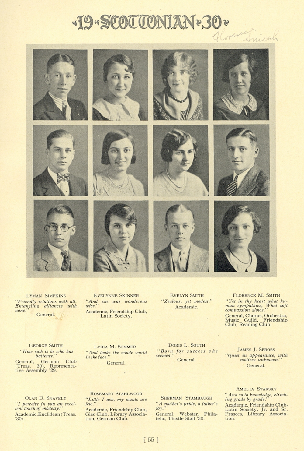 1930 Scott High School, Page 55: Lyman Simpkins, Evelynne Skinner, Evelyn Smith, Florence M. Smith, George Smith, Lydia M. Sommer, Doris L. South, James J. Spross, Olan D. Snavely, Rosemary Stahlwood, Sherman Stambaugh, Amelia Starsky.