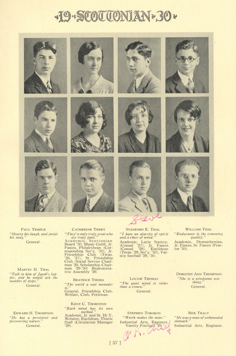 1930 Scott High School, Page 57: Paul Temple, Catherine Terry, Stanford E. Thal, William Thal, Martin H. Thal, Beatrice Thoma, Louise Thomas, Dorothy Ann Thompson, Edward H. Thompson, Kent C. Thornton, Stephen Tobakos, Rex Tracy.