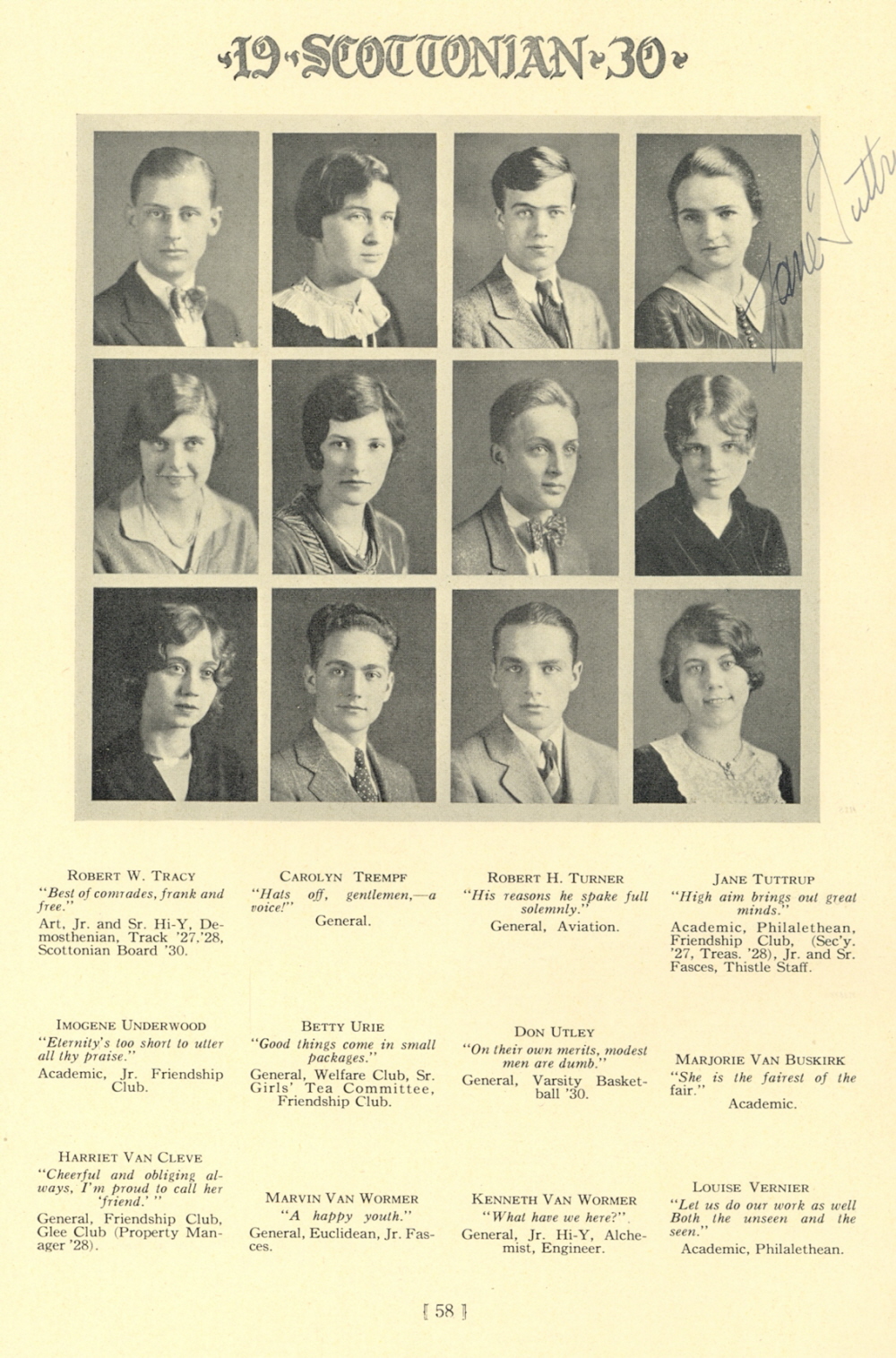 1930 Scott High School, Page 58: Robert W. Tracy, Carolyn Trempf, Robert H. Turner, Jane Tuttrup, Imogene Underwood, Betty Urie, Don Utley, Marjorie Van Buskirk, Harriet Van Cleve, Marvin Van Wormer, Kenneth Van Wormer, Louise Vernier.
