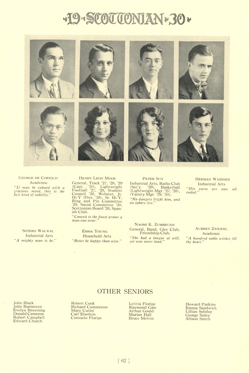 1930 Scott High School, Page 62: George De Coriolis, Henry Leon Moor, Peter Sun, Herman Waidner, Sotero Walwal, Emma Young, Naomi K. Zumbrunn, Aubrey Zweifel, John Black, John Burnsteen, Evelyn Browning, Donald Cameron, Robert Campbell, Edward Church, Robert Cook, Richard Cummerow, Mary Cutler, Carl Eberlein, Consuelo Floripe, Letitia Floripe, Raymond Gale, Arthur Gould, Marian Hall, Bruce Melvin, Howard Parkins, Emma Sandwich, Lillian Soliday, George Sisley, Allison Smith.