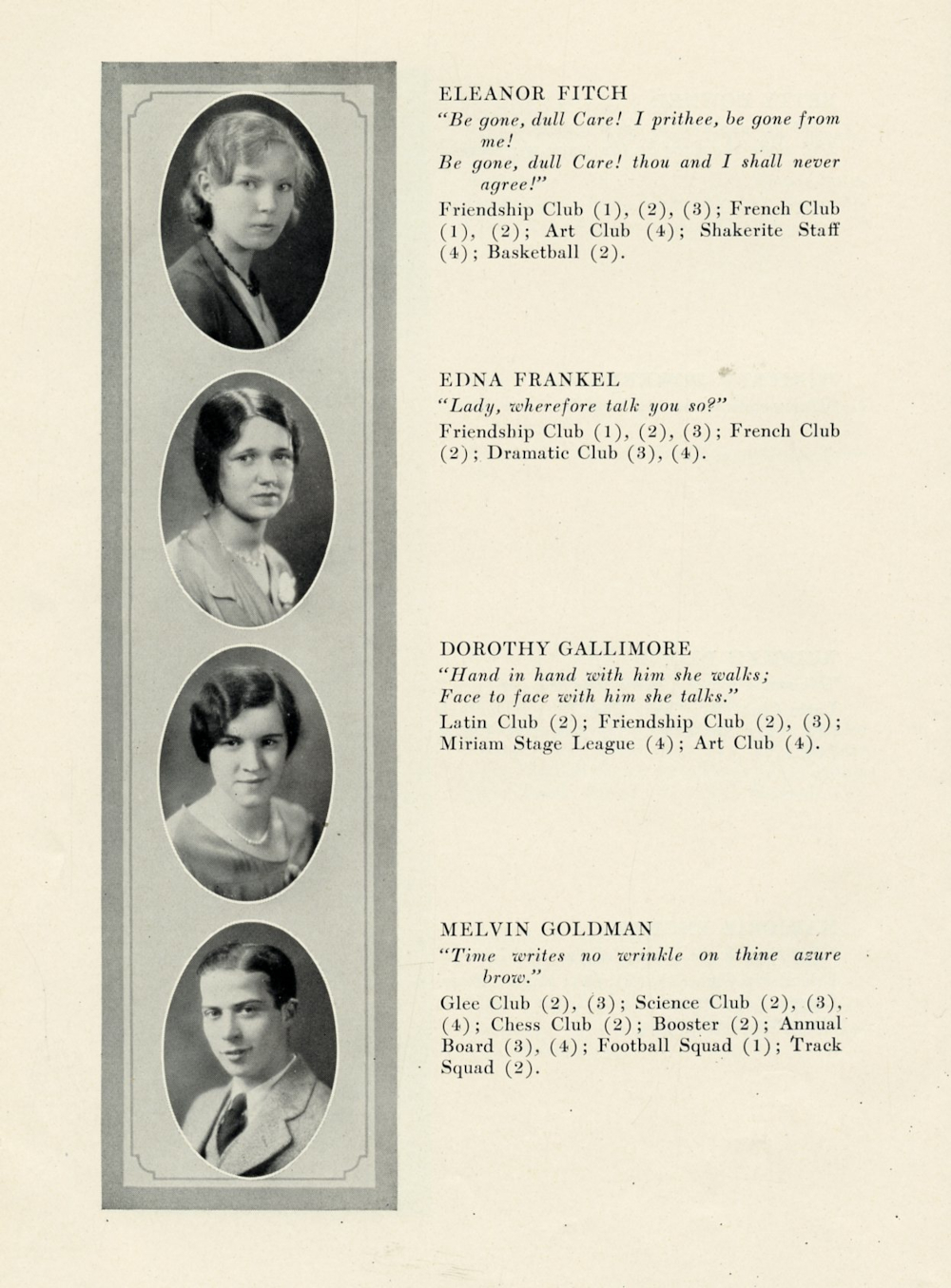 1930 Shaker Heights High School, Page 24: Eleanor Fitch, Edna Frankel, Dorothy Gallimore, Melvin Goldman.