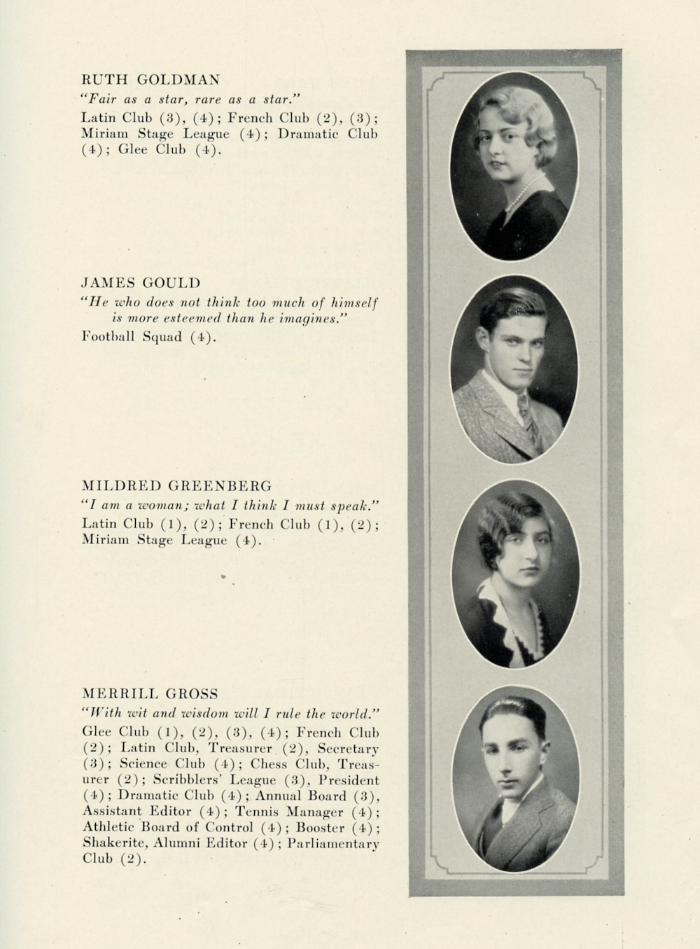 1930 Shaker Heights High School, Page 25: Ruth Goldman, James Gould, Mildred Greenberg, Merrill Gross.