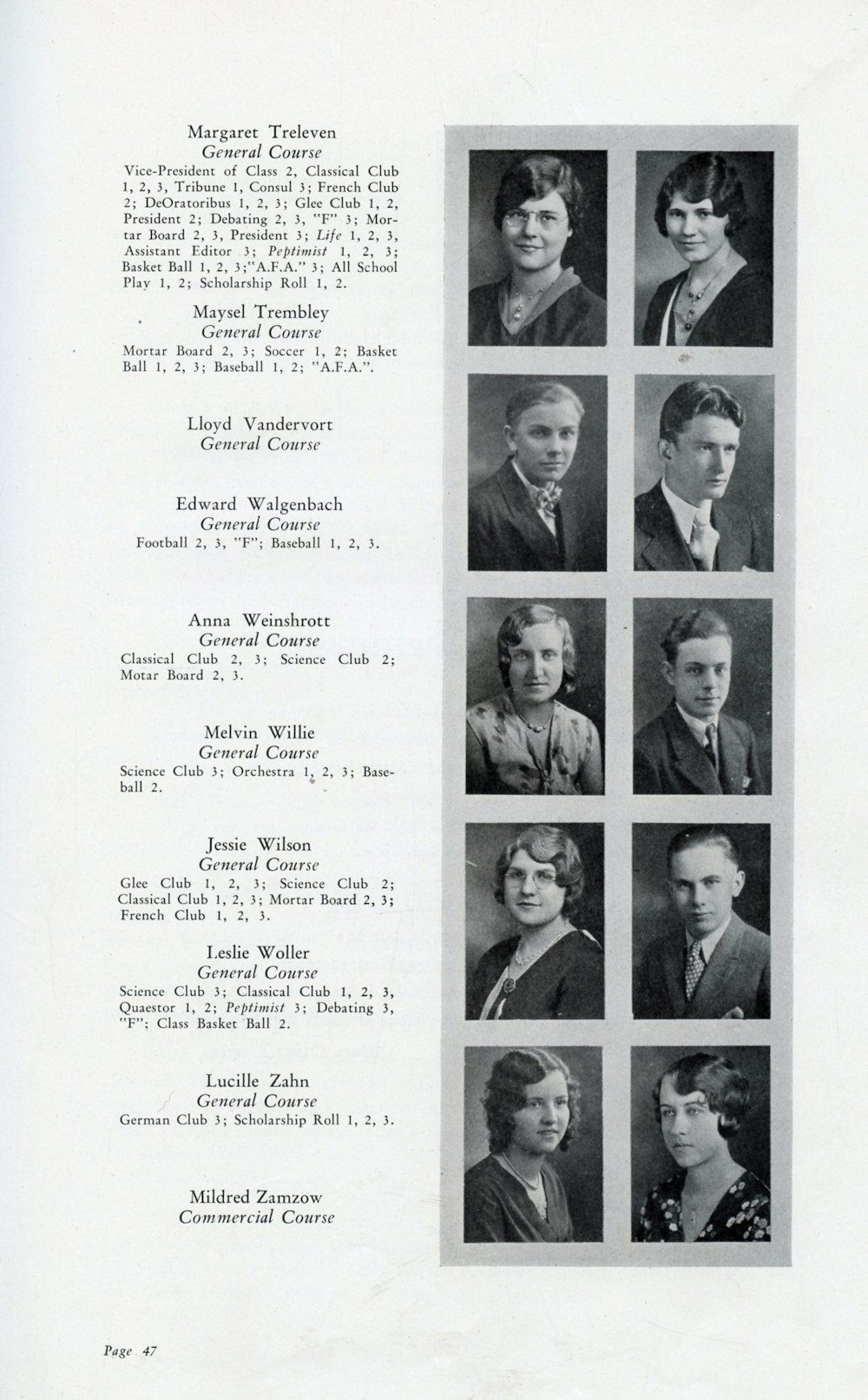 1931 Fond du Lac High School, Page 47: Margaret Treleven, Maysel Trembley, Lloyd Vandervort, Edward Walgenbach, Anna Weinshrott, Melvin Willie, Jessie Wilson, Leslie Woller, Lucille Zahn, Mildred Zamzow.