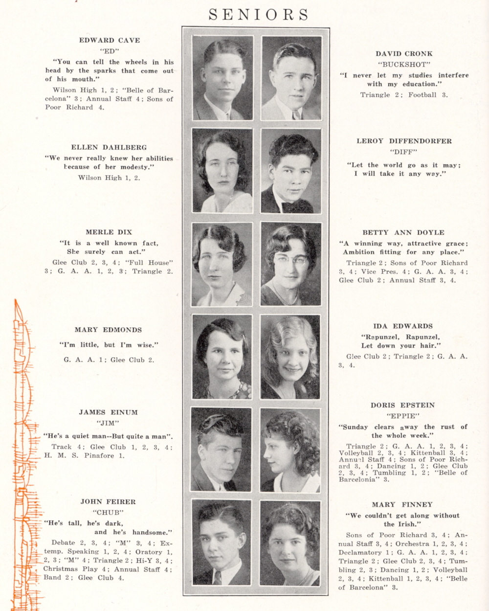 1932 Menomonie High School, Page 18: Edward Cave, David Cronk, Ellen Dahlberg, Leroy Diffendorfer, Merle Dix, Betty Ann Doyle, Mary Edmonds, Ida Edwards, James Einum, Doris Epstein, John Feirer, Mary Finney.