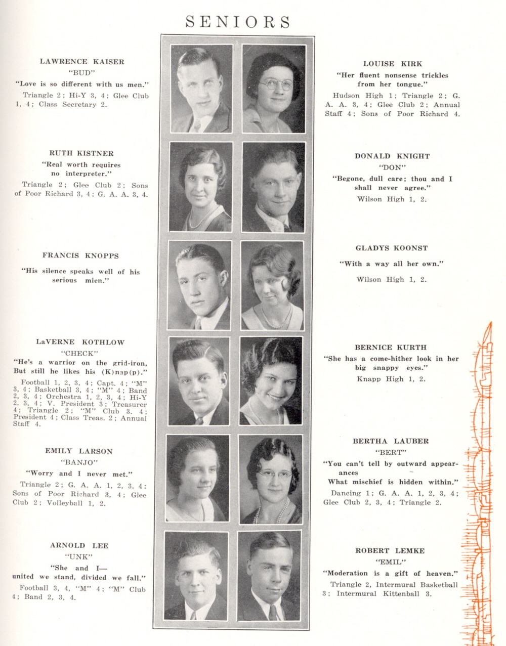 1932 Menomonie High School, Page 21: Lawrence Kaiser, Louise Kirk, Ruth Kistner, Donald Knoght, Francis Knopps, Gladys Koonst, LaVerne Kothlow, Bernice Kurth, Emily Larson, Bertha Lauber, Arnold Lee, Robert Lemke.