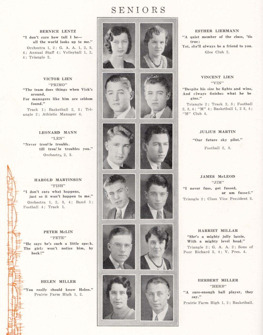 1932 Menomonie High School, Page 22: Bernice Lentz, Esther Liermann, Victor Lien, Vincent Lien, Leonard Mann, Julius Martin, Harold Martinson, James McLeod, Peter McLin, Harriet Millar, Helen Miller, Herbert Miller.