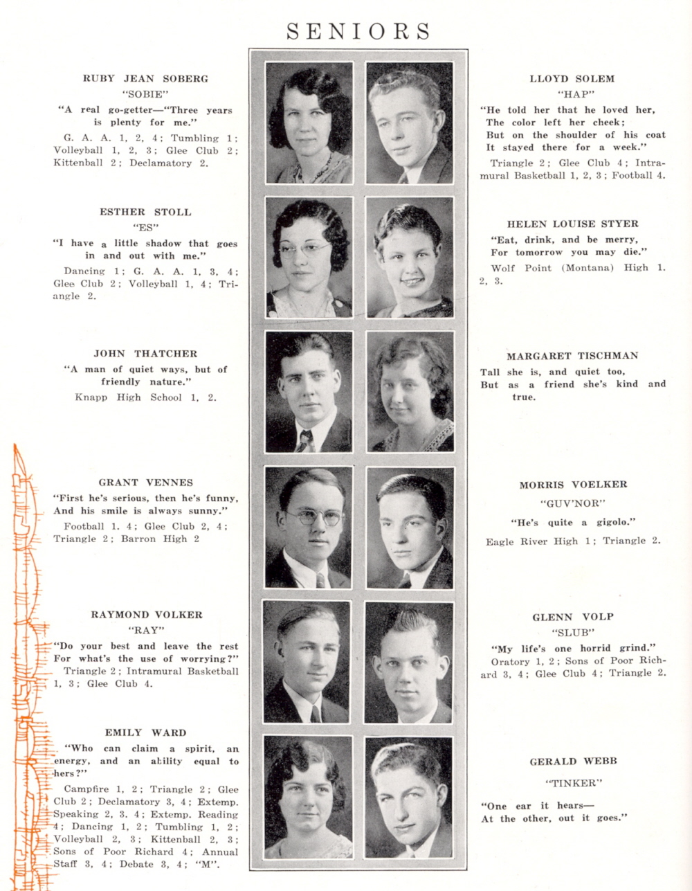 1932 Menomonie High School, Page 26: Ruby Jean Soberg, Lloyd Solem, Esther Stoll, Helen Louise Styer, John Thatcher, Margaret Tischman, Grant Vennes, Morris Voelker, Raymond Volker, Glenn Volp, Emily Ward, Gerald Webb.
