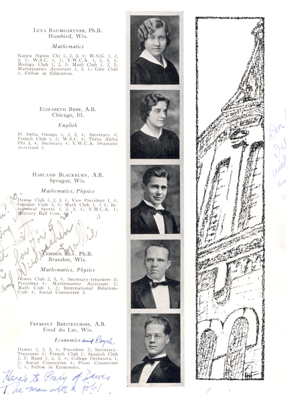 1932 Ripon College, Page 37: Lena Baumgartner, Elizabeth Bede, Harland Blackburn, Gordon Bly, Fremont Breitengross.