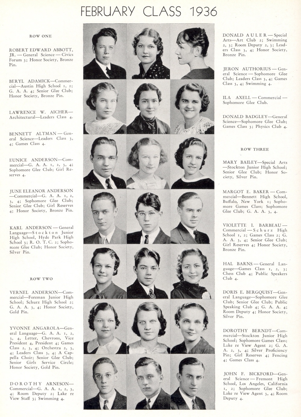 1936 Chicago Lake View High School, Page 46: Robert Edward Abbott, Beryl Adamick, Lawrence W. Aicher, Bennett Altman, Eunice Anderson, June Eleanor Anderson, Karl Anderson, Vernel Anderson, Yvonne Angarola, Dorothy Arneson, Donald Auler, Jeron Authorius, Ila Axell, Donald Badgley, Mary Bailey, Margot E. Baker, Violette I. Barbeau, Hal Barns, Doris E. Bergquist, Dorothy Berndt, John F. Bickford.