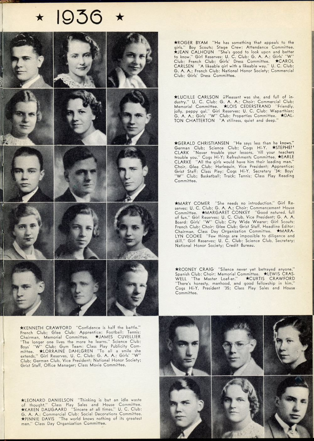 Mary Comer, Margaret Conkey, Maralyn Cooke, Rodney Craig, Lewis Craswell, Curtis Crawford, Kenneth Crawford, James Cuvellier, Lorraine Dahlgren, Leonard Danielson, Karen Daugaard, Pinnie Davis.
