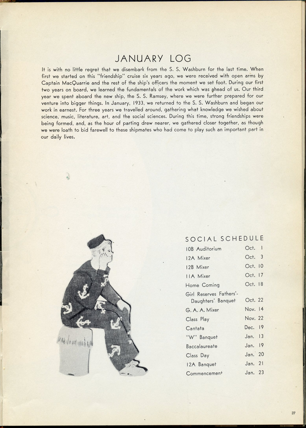 1936 Washburn High School Yearbook Page 37: January Log, Social Schedule.