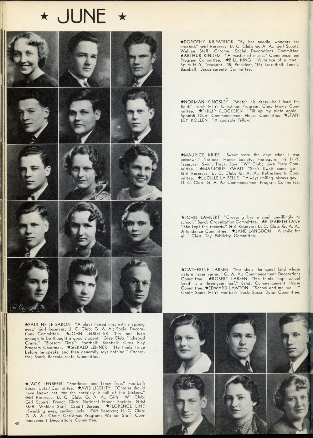 John Lambert, Elizabeth Lane, Jane Langdon, Catherine Larsen, Robert Larsen, Edward Lawton, Pauline Le Baron, John Ledbetter, Gerald Lehner, Jack Lenberg, Avis Liechty, Florence Lind.