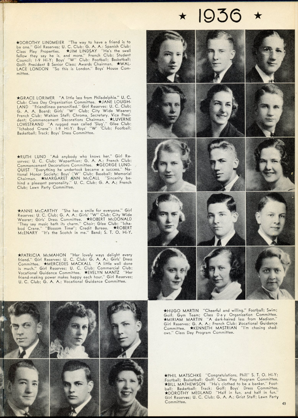 Anne McCarthy, Robert McDonald, Robert McEnary, Patricia McMahon, Mercedes Mackall, Evelyn Mantz, Hugo Martin, Miriam Martin, Kenneth Mastrian, Phil Matschke, Bill Mathewson, Dorothy Medland.