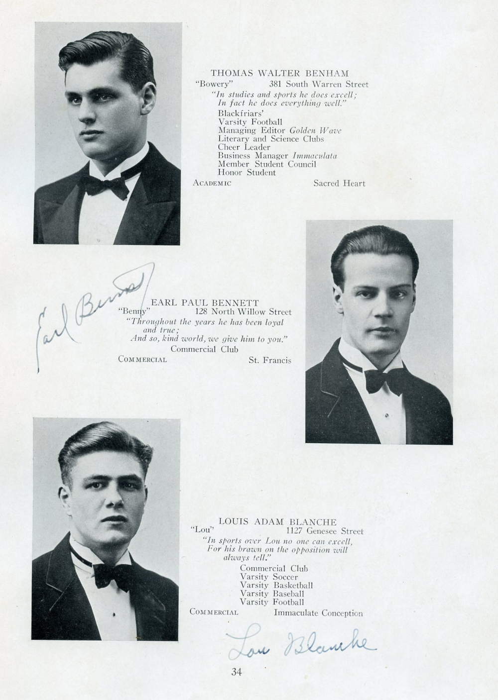 1937 Immaculate Conception Boys High School, Page 34: Thomas Walter Benham, Earl Paul Bennett, Louis Adam Blanche.