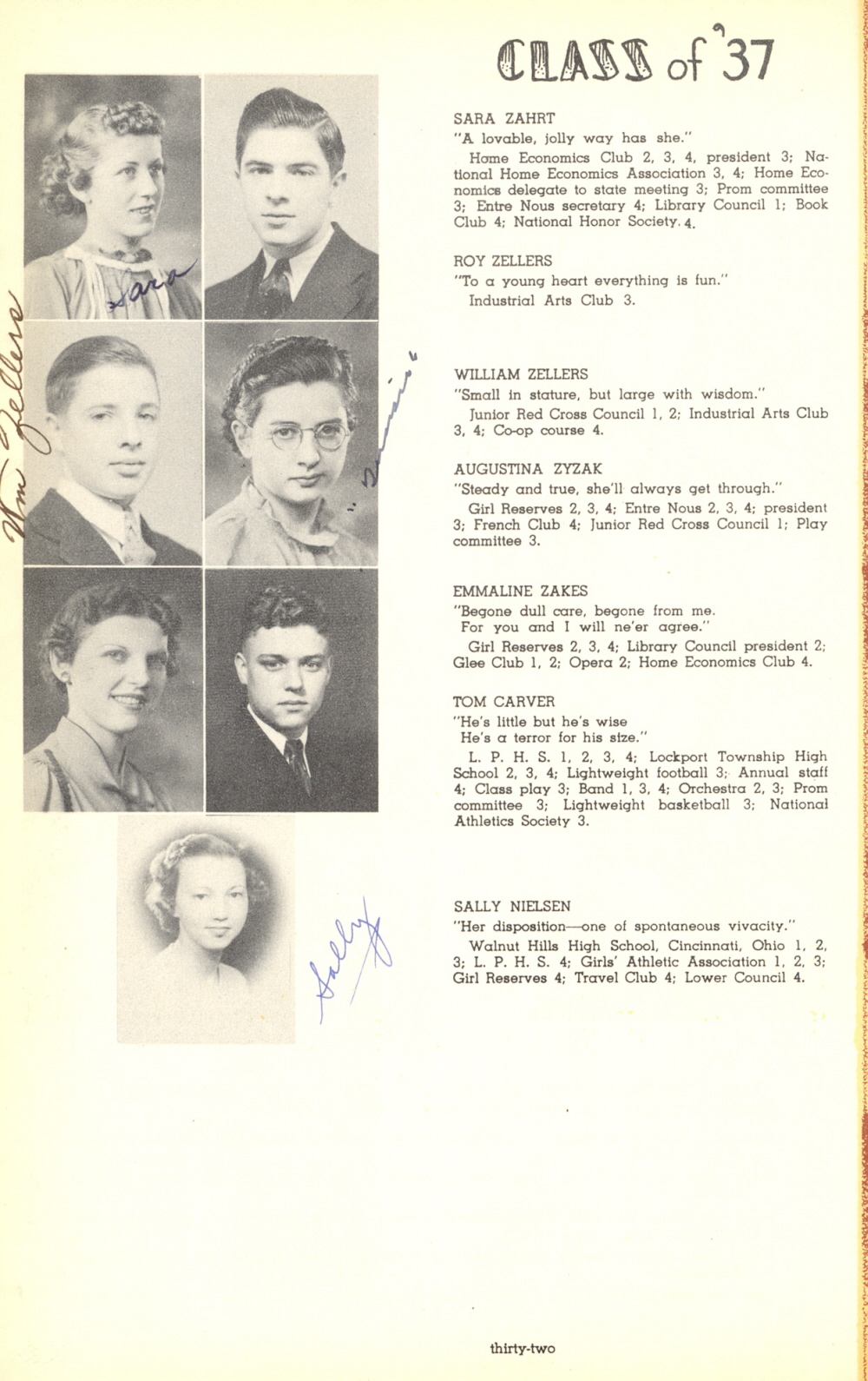 1937 LaPorte High School, Page 32: Sara Zahrt, Roy Zellers, William Zellers, Augustina Zyzak, Emmaline Zakes, Tom Carver, Sally Nielsen.