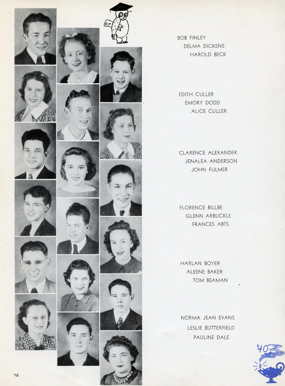 1940 Iola High School Yearbook Page 12: Bob Finley, Delma Dickens, Harold Beck, Edith Culler, Emory Dodd, Alice Culler, Clarence Alexander, Jenalea Anderson, John Fulmer, Florence Billbe, Glenn Arbuckle, Frances Abts, Harlan Boyer, Aleene Baker, Tom Beaman, Norma Jean Evans, Leslie Butterfield, Pauline Dale.