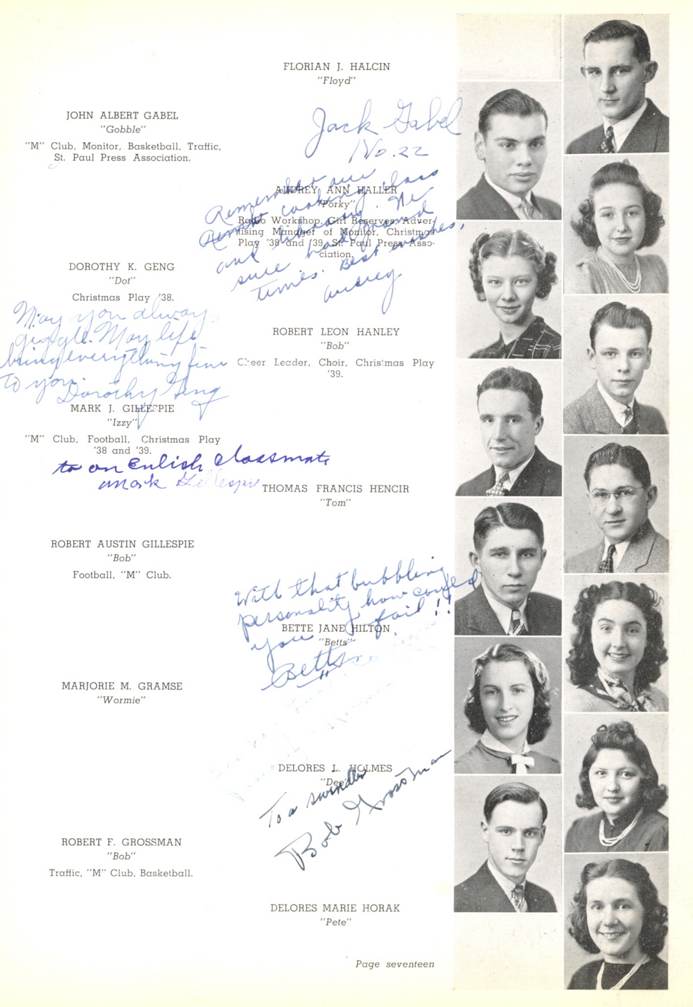 1940 Monroe High School, Page 17: John Albert Gabel, Dorothy K. Geng, Mark J. Gillespie, Robert Austin Gillespie, Marjorie M. Granse, Robert F. Grossman, Florian J. Halcin, Audrey Ann Haller, Robert Leon Hanley, Thomas Francis Hencir, Bette Jane Hilton, Delores L. Holmes, Delores Marie Horak.