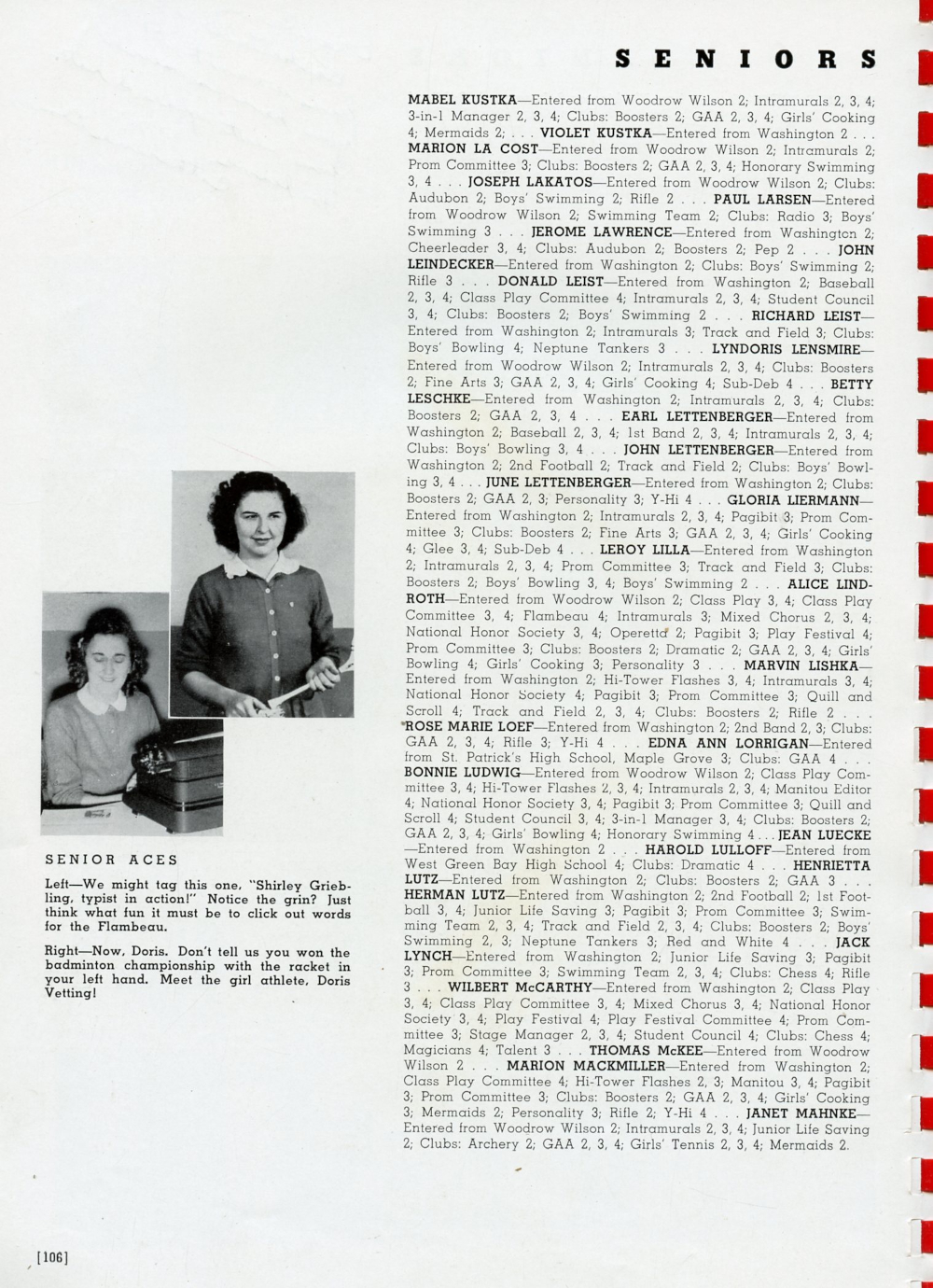 Rose Marie Loef, Edna Ann Lorrigan, Bonnie Ludwig, Jean Luecke, Harold Lulloff, Henrietta Lutz, Herman Lutz, Jack Lynch, Wilbert McCarthy, Thomas McKee, Marion Mackmiller,