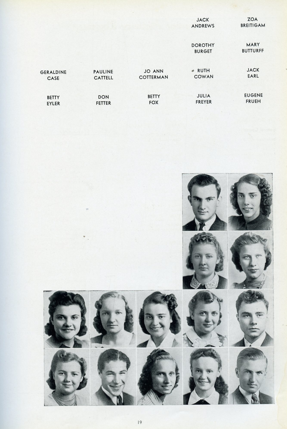 1941 Shawnee High School, Page 19: Jack Andrews, Zoa Breitigam, Dorothy Burget, Mary Butturff, Geraldine Case, Pauline Cattell, Joann Cotterman, Ruth Cowan, John E. Earl, Betty Louise Eyler, Don Fetter, Betty Fox, Julia Freyer, Eugene Frueh.