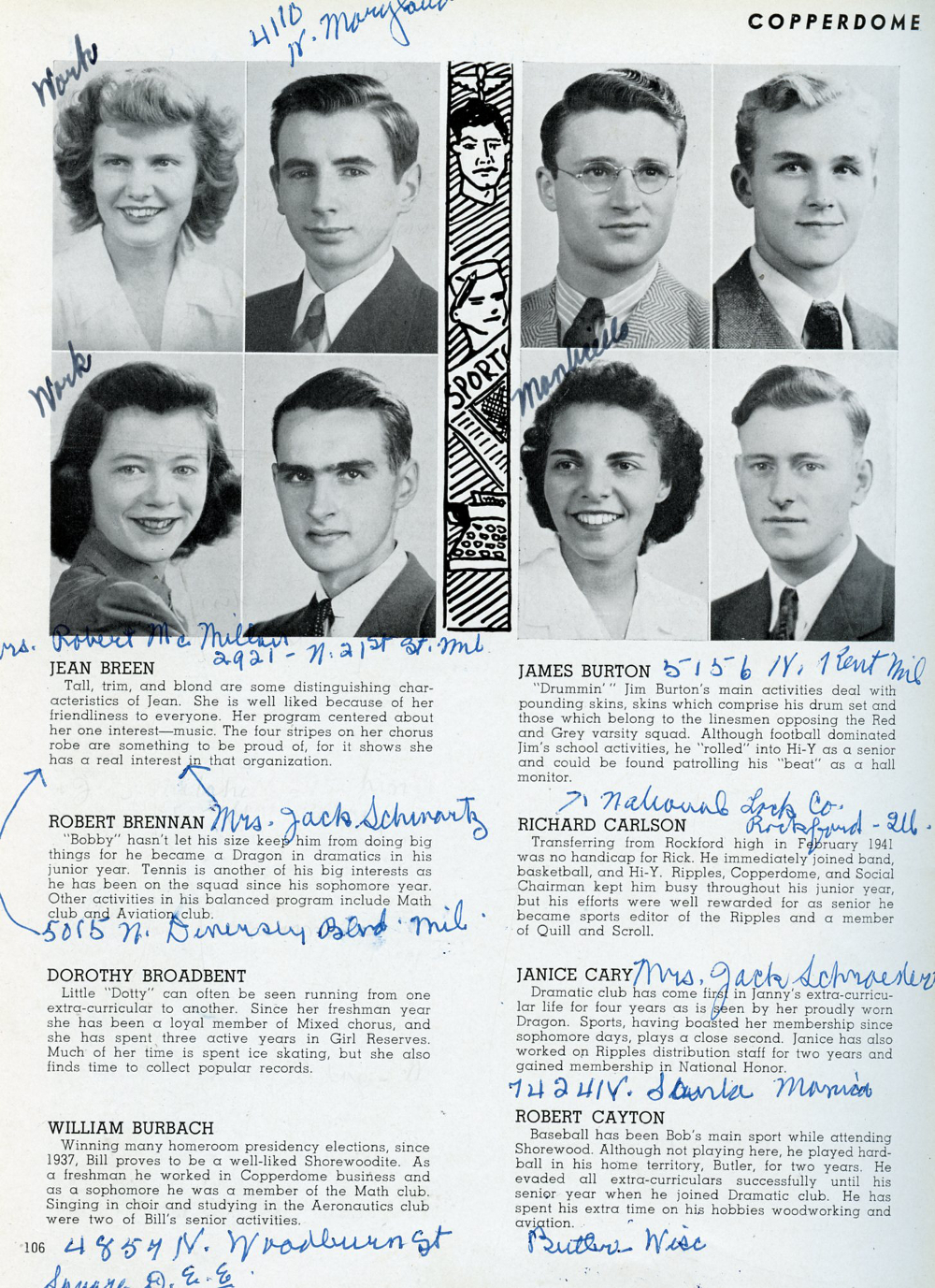 1943 Shorewood High School Yearbook Page 106: Jean Breen, Robert Brennan, Dorothy Broadbent, William Burbach, James Burton, Richard Carlson, Janice Cary, Robert Cayton.