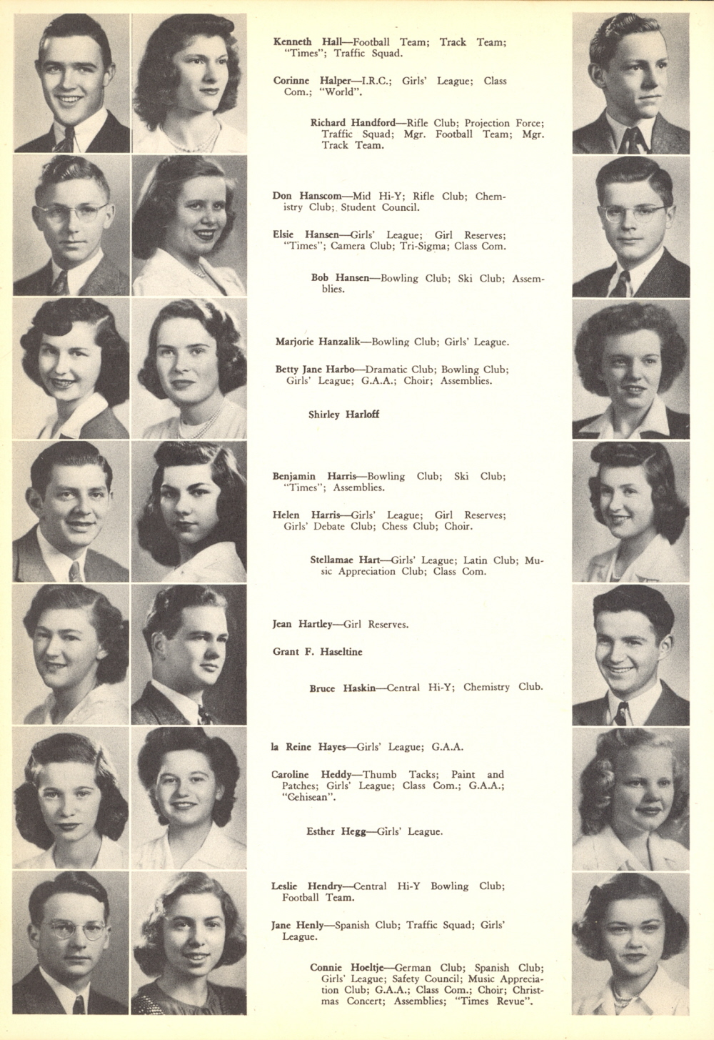 1943 St. Paul Central High School, Page 28: Kenneth Hall, Corinne Halper, Richard Handford, Don Hanscom, Elsie Hansen, Bob Hansen, Marjorie Hanzalik, Betty Jane Harbo, Shirley Harloff, Benjamin Harris, Helen Harris, Stellamae Hart, Jean Hartley, Grant F. Haseltine, Bruce Haskin, la Reine Hayes, Caroline Heddy, Esther Hegg, Leslie Hendry, Jane Henly, Connie Hoeltje.