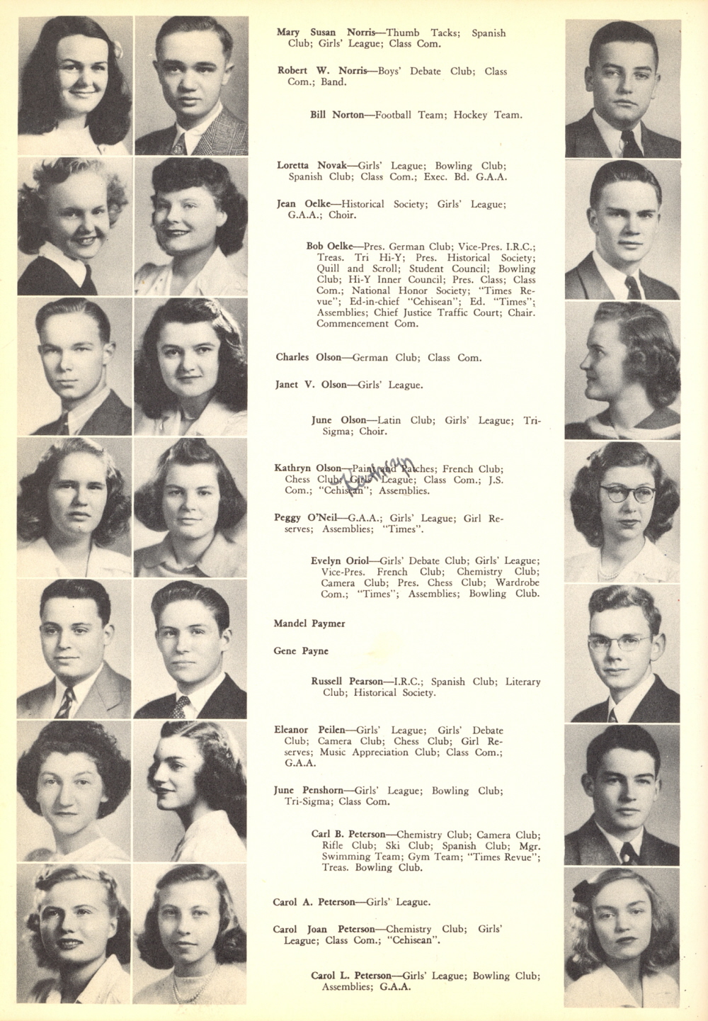 1943 St. Paul Central High School, Page 34: Mary Susan Norris, Robert W. Norris, Bill Norton, Loretta Novak, Jean Oelke, Bob Oelke, Charles Olson, Janet V. Olson, June Olson, Kathryn Olson, Peggy O'Neil, Evelyn Oriol, Mandel Paymer, Gene Payne, Russell Pearson, Eleanor Peilen, June Penshorn, Carl B. Peterson, Carol A. Peterson, Carol Joan Peterson, Carol L. Peterson.